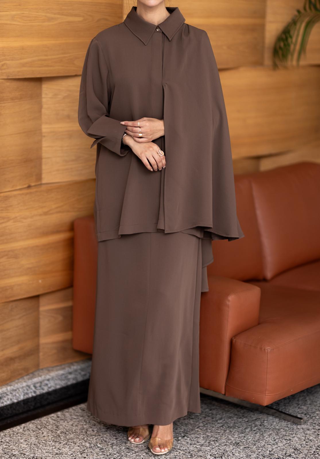 – Cape effet légèrement drapé sur l’épaule tombant sur le bras